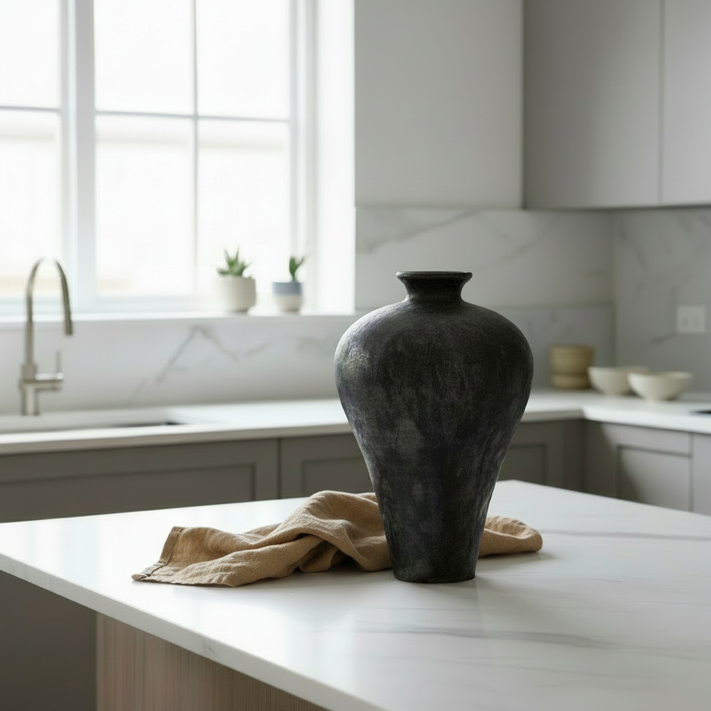 Discover the understated beauty of our Gohobi Japanese-style wabi sabi handmade large vase, where imperfection becomes art. Each piece is entirely unique, crafted by hand with meticulous attention to detail, ensuring no two vases are alike. Standing at 31.5cm tall and 20cm wide, this striking black and gold vessel commands attention as a focal point in any room—whether displayed in your kitchen, living room, or entryway. The wabi sabi philosophy celebrates the beauty of simplicity and natural imperfection, making this vase a sophisticated choice for those who appreciate authentic craftsmanship. A meaningful gift for housewarming celebrations or a luxurious addition to your own home, this handmade treasure brings warmth, elegance, and timeless style to your space.